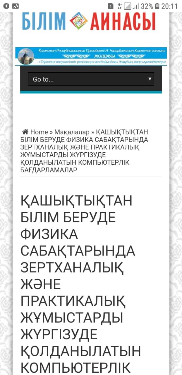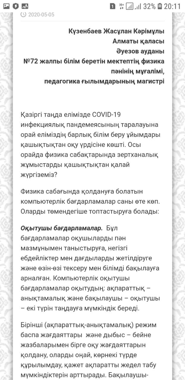 Республикалық "Білім айнасы" ғылыми-танымдық газетіне және оның ресми сайтына мектебіміздің физика пәнінің мұғалімі Күзенбаев Жасұлан Кәрімұлының @jasulan_kuzenbaev "Қашықтықтан білім беруде физика сабақтарында зертханалық және практикалық жұмыстарды жүргізуде қолданылатын компьютерлік бағдарламалар" тақырыбындағы мақаласы жарық көрді.