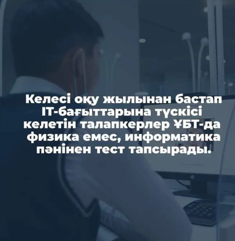 министрлік талдау жүргізіп, 2022-2023 оқу жылынан бастап «Информатика мұғалімдерін даярлау», «Ақпараттық технологиялар» және «Ақпараттық қауіпсіздік» білім беру бағдарламалары топтарына түсетін оқушылар ҰБТ-да «Математика+Физика» орнына «Математика+Информатика»комбинациясын тапсырады деген шешім қабылдады.