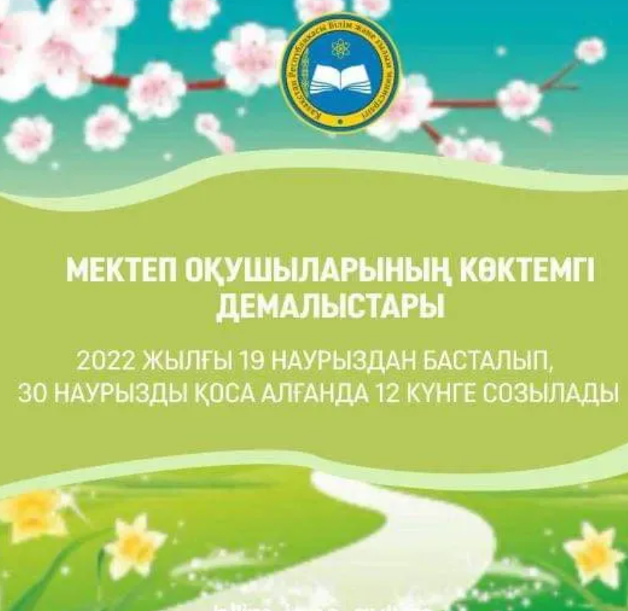 «Келесі аптада оқушыларымыздың көктемгі каникулы басталады. Демалыс 2022 жылғы 19 наурыздан басталып, 30 наурызды қоса алғанда 12 күнге созылады.