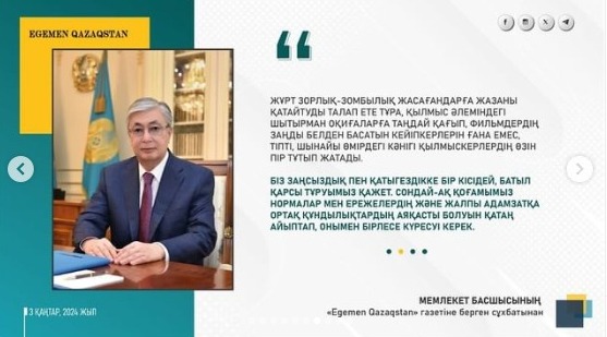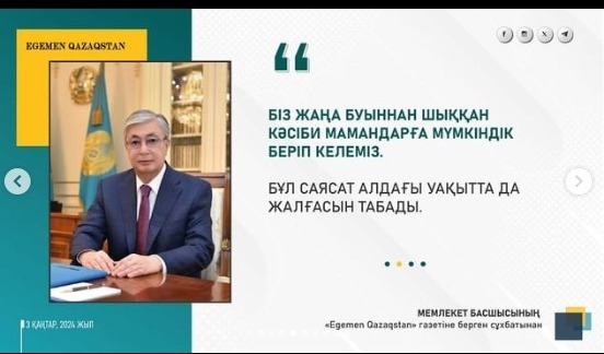 11 январь 2024 0 1 2 3 4 5 Мемлекет басшысының “Егемен Қазақстан” газетіне берген сұхбатынан үзінді. Мемлекет басшысының “Егемен Қазақстан” газетіне берген сұхбатынан үзінді.