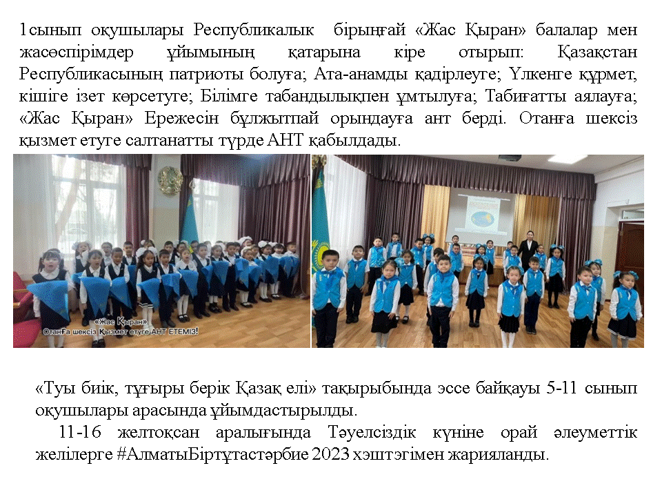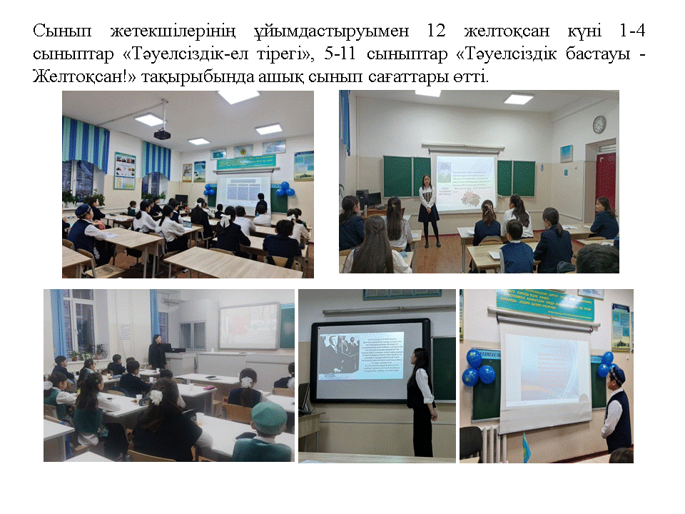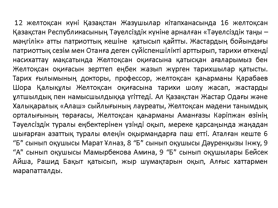 16 декабрь 2023 0 1 2 3 4 5 Қазақстан Республикасының 16 желтоқсан – Тәуелсіздік күніне және Желтоқсан көтерілісінің 37 жылдығына орай мектепішілік өткізілген іс-шаралар анықтама