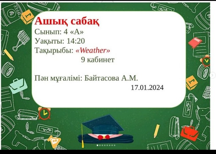 17 қаңтар күні қоғамдық-гуманитарлық пәндер әдістемелік бірлестігінің онкүндігі аясында ағылшын тілі пәнінің мұғалімі Байтасова Айгерім Манапбаевнаның 4 “А” сыныбымен “Weather” тақырыбында ашық сабағы болып өтті.