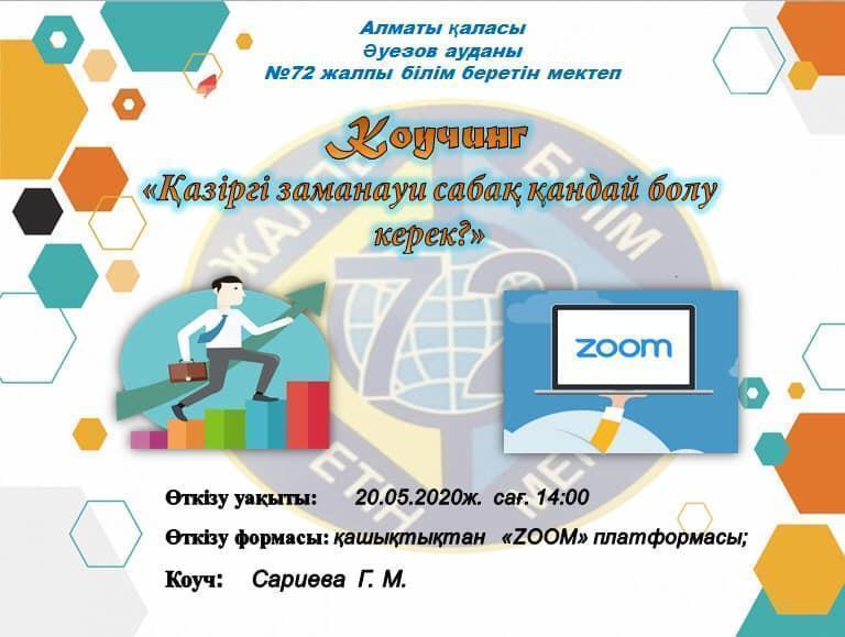 20 мамыр күні №72 жалпы білім беретін мектепте Zoom платформасында қашықтықтан "Қазіргі заманауи сабақ қандай болу керек?" тақырыбында коучинг болып өтті. Коучингқа Педагогикалық шеберлік орталығының Алматы қаласы филиалындағы мектеп көшбасшылары курсының тыңдаушылары (әр өңірдің мектеп директорлары) мен мектептің жас мамандары қатысты. Коучингты аталған курстың тыңдаушысы, мектеп директоры Сариева Гүлзира Молдабайқызы @gulzira_moldabaykizi өткізді. Коучингтың басында "Табысты сабақ" дегенді қалай түсінесіз?" атты сұраққа жас мамандар өз ойларын ортаға салды. Сонымен қатар сабақты өтуде сабақ жоспарын (қысқа мерзімді жоспар) құрастыруды, сонымен қатар жоспарда құндылықтарға баулу, оқытудың 4 дағдылары мен тілдік дағдыларды байланыстыру туралы айтылды. Аталған коучинг өз мақсатына жетіп, ұстаздар тарапынан кері байланыстар берілді. Жас мамандардың іс-тәжірибесін арттыратын коучингты өткізген Гулзира Молдабайқызына алғысымызды білдіреміз.