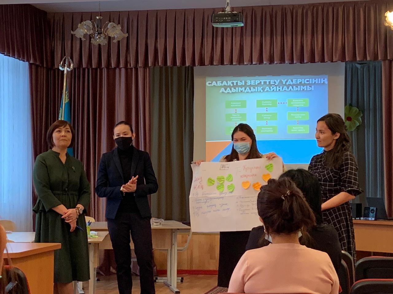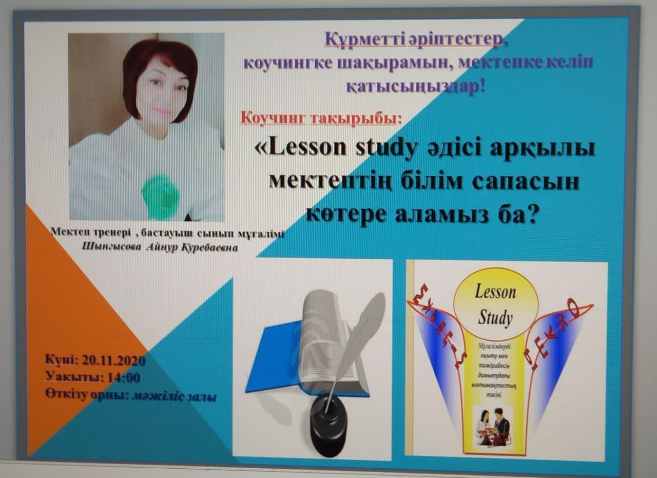 20 қараша күні мектебіміздің мәжіліс залында мектеп тренері, "педагог-зерттеуші" біліктілік санатындағы бастауыш сынып мұғалімі Шынгысова Айнур Куребаевнаның ұйымдастыруымен "Lesson Study әдісі арқылы мектептің білім сапасын көтере аламыз ба?" тақырыбында коучинг болып өтті. Коучинг сыйымдылығы 15 мұғалімнен аспайтын, арақашықтықты және барлық санитарлық жағдайларды сақтай отырып ұйымдастырылды. Коучингте жағдаяттық сұрақтар қойылып, ұстаздар өз ойларымен бөлісті. Коучинг барысында ұстаздар Lesson Study-ды SWOT талдауға салып, күшті-әлсіз, сәтті-сәтсіз және мүмкіндіктерін қарастырып, постер қорғады. Коучерге кері байланыстар берілді, ұсыныстар айтылды. Аталған коучингты жоғары деңгейде ұйымдастырған Айнур Куребаевнаға алғысымызды білдіреміз.