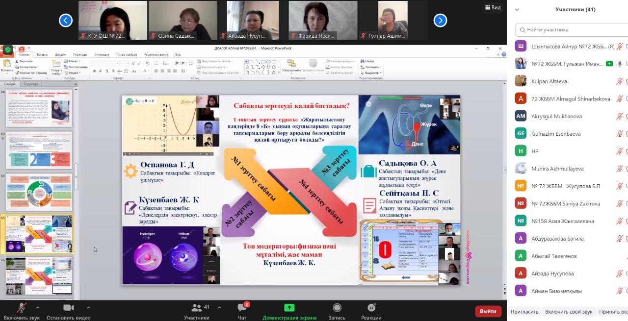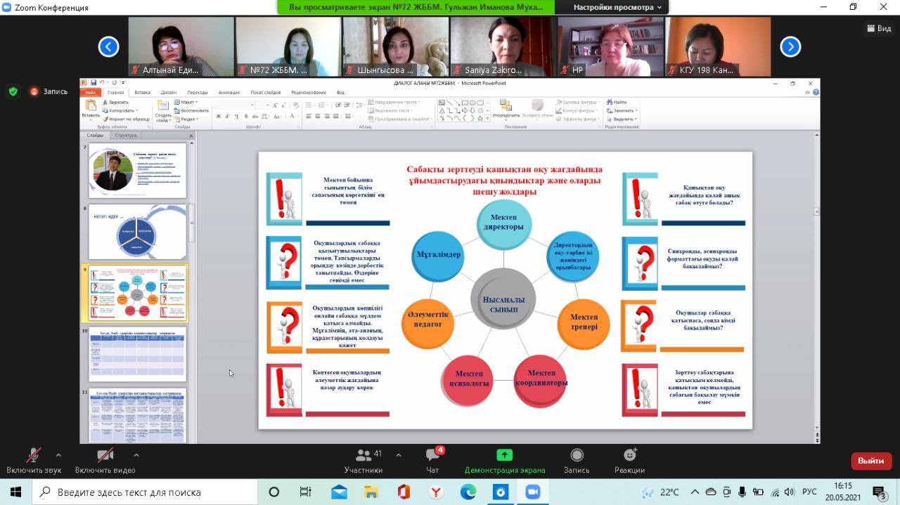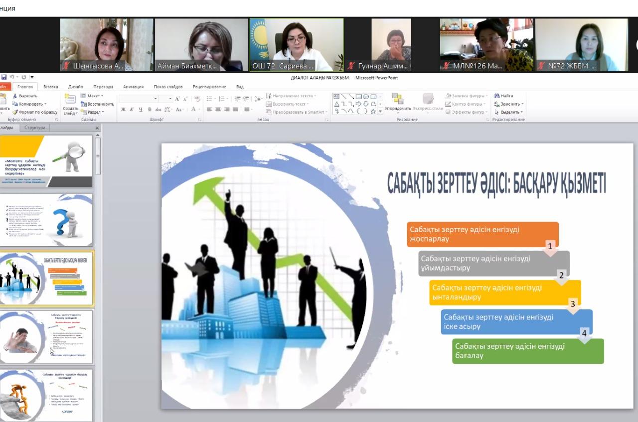 20 мамыр күні №72 жалпы білім беретін мектепте қашықтан zoom платформасында Алматы қаласы Педагогикалық шеберлік орталығының аға тренері Бипажанова Айман Биахметқызының ұйымдастыруымен "Мектепте сабақты зерттеу үдерісін енгізуді басқару: нәтиже және кедергілер" тақырыбында диалог алаңы болып өтті. Диалог алаңына аталған орталықтың тренерлері мен жетекші және серіктес мектептердің басшылары мен пән мұғалімдері қатысты. Диалог алаңында Педагогикалық шеберлік орталығының "Мектеп көшбасшылары" курсының тыңдаушысы, мектеп директоры Сариева Гулзира Молдабайқызы, мектеп директорының ғылыми-әдістемелік жұмыстар жөніндегі орынбасары, мектеп координаторы Иманова Гульжан Мухаметказиновна және бастауыш сынып мұғалімі, мектеп тренері Шынгысова Айнур Куребаевна мектептегі сабақты зерттеу үдерісі және нысаналы 3 "Б" және 8 "Б" сыныптарымен жасалған жұмыстар жайлы тәжірибелерімен бөлісті. Конференция соңында қатысушылар тарапынан сындарлы кері байланыстар берілді.