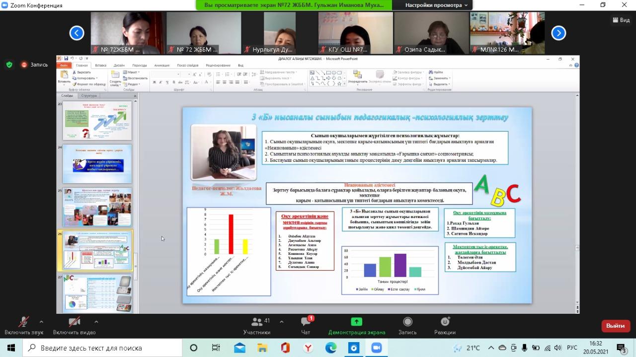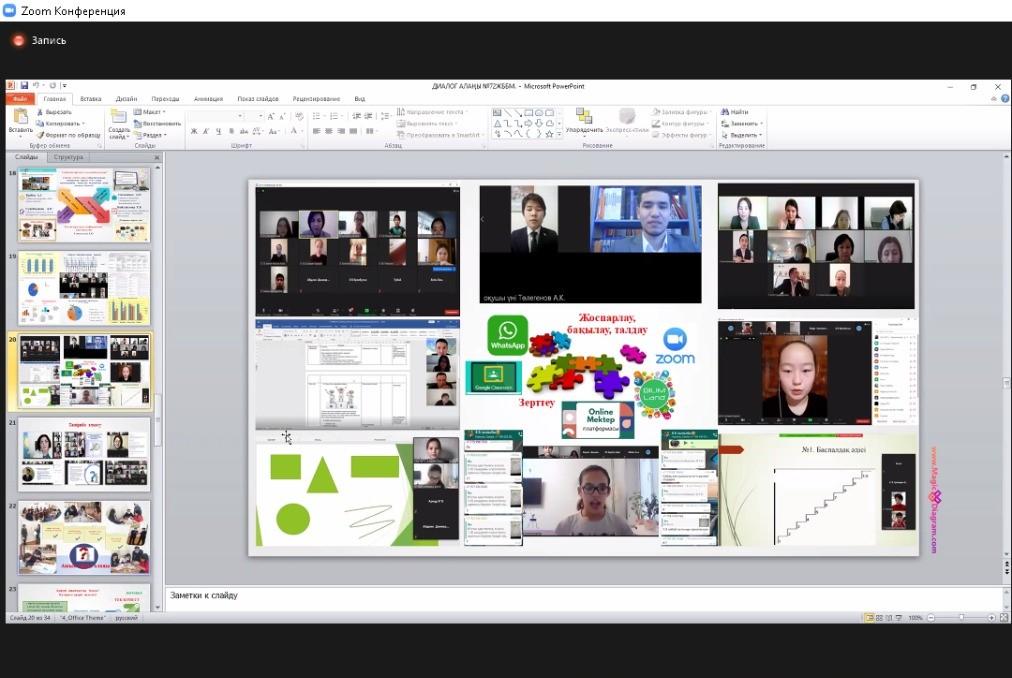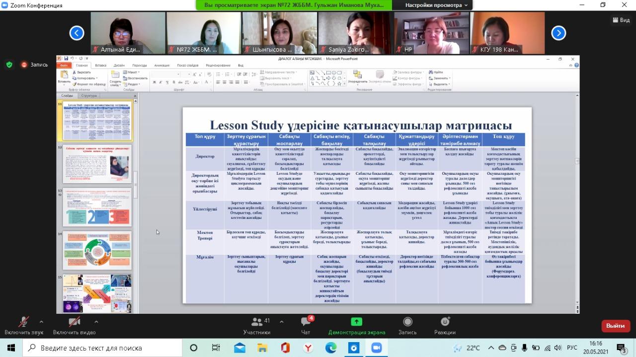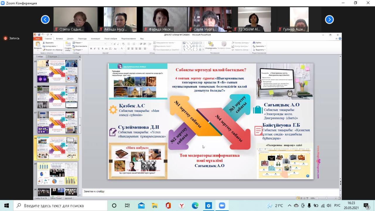 20 мамыр күні №72 жалпы білім беретін мектепте қашықтан zoom платформасында Алматы қаласы Педагогикалық шеберлік орталығының аға тренері Бипажанова Айман Биахметқызының ұйымдастыруымен "Мектепте сабақты зерттеу үдерісін енгізуді басқару: нәтиже және кедергілер" тақырыбында диалог алаңы болып өтті. Диалог алаңына аталған орталықтың тренерлері мен жетекші және серіктес мектептердің басшылары мен пән мұғалімдері қатысты. Диалог алаңында Педагогикалық шеберлік орталығының "Мектеп көшбасшылары" курсының тыңдаушысы, мектеп директоры Сариева Гулзира Молдабайқызы, мектеп директорының ғылыми-әдістемелік жұмыстар жөніндегі орынбасары, мектеп координаторы Иманова Гульжан Мухаметказиновна және бастауыш сынып мұғалімі, мектеп тренері Шынгысова Айнур Куребаевна мектептегі сабақты зерттеу үдерісі және нысаналы 3 "Б" және 8 "Б" сыныптарымен жасалған жұмыстар жайлы тәжірибелерімен бөлісті. Конференция соңында қатысушылар тарапынан сындарлы кері байланыстар берілді.