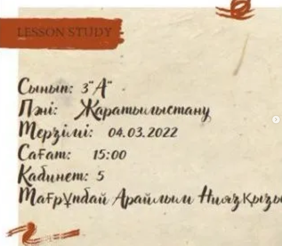 4 наурыз күні Lesson Study- Сабақты зерттеу бойынша нысанадағы 3 "А" сыныбына жаратылыстану пәнінен бастауыш сынып мұғалімі, педагог-модератор Мағрупбай Арайлым Ниязқызының "Ауырлық күші дегеніміз не?" тақырыбындағы зерттеу сабағы болып өтті. Сабақ үдерісінде оқушылар тақырыпқа қатысты зертханалық жұмыстар жасады. "Топтық жұмыс арқылы оқушылардың белсенділіктерін арттыра аламыз ба?" зерттеу сұрағының аясында оқушылар топтық жұмыстарға арналған тапсырмаларды орындады. Бірлесе жоспарланған зерттеу сабағы өз мақсатына жетті.