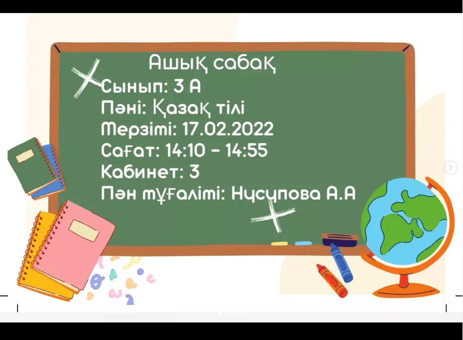 17 ақпан күні "Бастауышым бастамам, білім жолын бастаған" атты бастауыш сынып мұғалімдері әдістемелік бірлестігінің онкүндігі аясында бастауыш сынып мұғалімі, педагог-зерттеуші Нусупова Айзада Айғабылқызының 3 "А" сыныбымен қазақ тілі пәнінен "Атақты тұлғалар. Етістік туралы білетінімді еске түсіремін" тақырыбындағы ашық сабағы болып өтті. Сабақ басында "Ой қозғау" арқылы оқушыларға атақты тұлғалардың суреттерін табу арқылы олар жайлы мәліметтер берді. Сабақ үдерісінде оқушылар топтық жұмыстарды орындап,мәтіннен етістікті анықтап, жауаптары QR-код арқылы интербелсенді тақтадан көрсетілді. Сабақ соңында қоржын арқылы бағаланып, оқушылар тарапынан кері байланыстар берілді. Ашық сабақ өз мақсатына жетті.