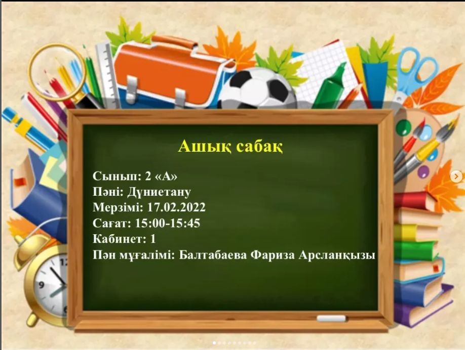 17 ақпан күні "Бастауышым бастамам, білім жолын бастаған" атты бастауыш сынып мұғалімдері әдістемелік бірлестігінің онкүндігі аясында бастауыш сынып мұғалімі, педагог-модератор Балтабаева Фариза Арсланқызының 2 "А" сыныбымен дүниетану пәнінен "Мемлекеттік мерекелер" тақырыбындағы ашық сабағы болып өтті. Сабақ үдерісінде оқушылар қазақтың ұлттық мейрамы—Наурыз, ұлттық тағамдары мен салт-дәстүрлері, ұлттық ойындар жайлы мағұлматтармен танысып, топтық жұмыстарды орындады. Сабақ соңында оқушылар тарапынан кері байланыстар берілді. Жаңартылған білім мазмұнына сай жоспарланған ашық сабақ өз мақсатына жетті.