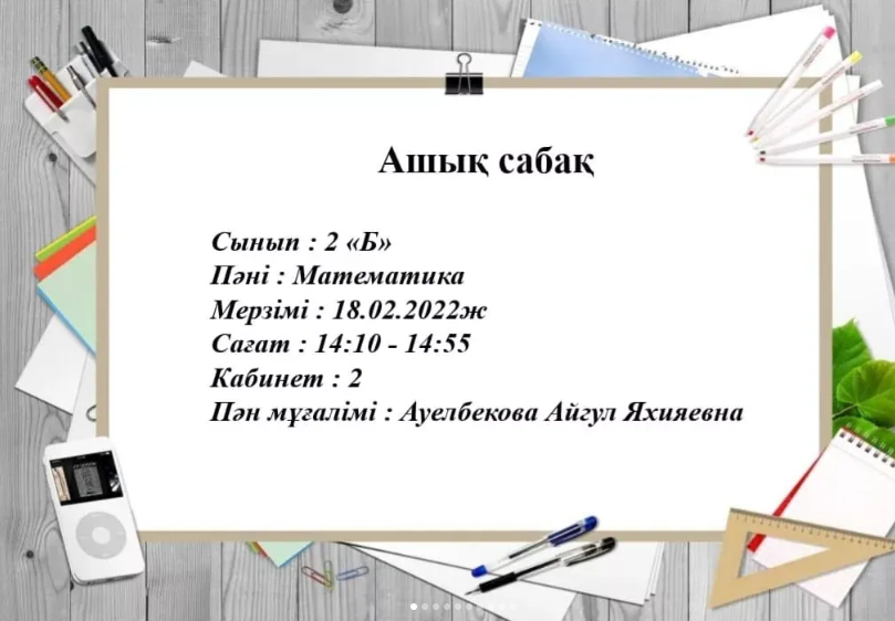 18 ақпан күні "Бастауышым бастамам, білім жолын бастаған" атты бастауыш сынып мұғалімдері әдістемелік бірлестігінің онкүндігі аясында бастауыш сынып мұғалімі Ауелбекова Айгул Яхияевнаның 2 "Б" сыныбымен математика пәнінен "2 мен 5 сандарына көбейту және бөлу кестесін бекіту" тақырыбындағы ашық сабағы болып өтті. Сабақ үдерісінде оқушылар топта есептер шығарып, жаңа сабаққа қатысты тапсырмаларды орындады. Жаңартылған білім мазмұнына сай жоспарланған ашық сабақ өз мақсатына жетті.