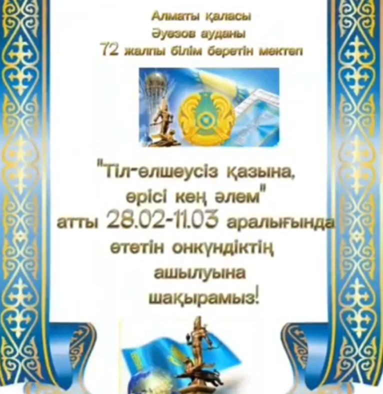 Құрметті ұстаздар, оқушылар! Сіздерді 28 ақпан мен 11 наурыз аралығында мектебімізде өткізілетін "Тіл—өлшеусіз қазына, өрісі кең әлем" атты қазақ тілі мен әдебиеті пәндер әдістемелік бірлестігінің онкүндігіне шақырамыз. Мақсаты: жас ұрпақтың өз ана тіліне деген құрмет сезімін арттыру, таза, шешен сөйлеуге үйрету, өз ұлтына, еліне деген сүйіспеншілігін ояту.
