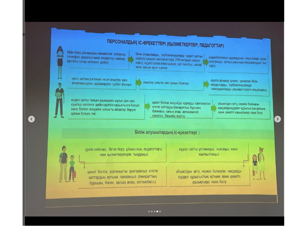 12 май 2023 0 1 2 3 4 5 «№72 ЖББМ» КММ-нің ұжымына террористік қауіп жағдайында өзін-өзі ұстау ережелері