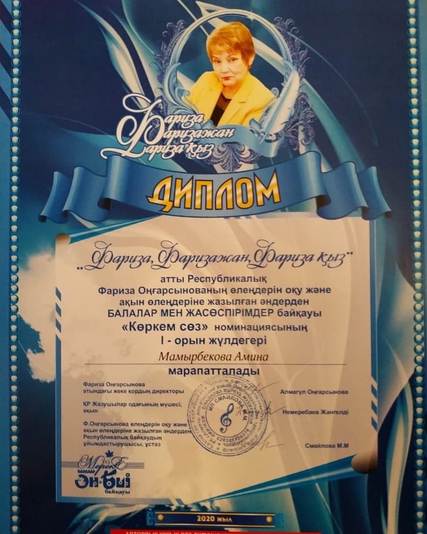 "Фариза, Фаризажан, Фариза қыз" атты Республикалық Фариза Оңғарсыновaның өлеңдерін оқу және ақын өлеңдеріне жазылған әндерден балалар мен жасөспірімдер байқауында "Көркем сөз" номинациясы бойынша мектебіміздің 6 "А" сынып оқушысы Мамырбекова Амина жүлделі І орынды иеленді. Жеңісімен шын жүректен құттықтай отырып, сайысқа дайындаған жетекшісі, мектебіміздің жоғары санатты қазақ тілі мен әдебиеті пәнінің мұғалімі Муханова Акрысгул Сейлхановнаға алғысымызды білдіреміз.