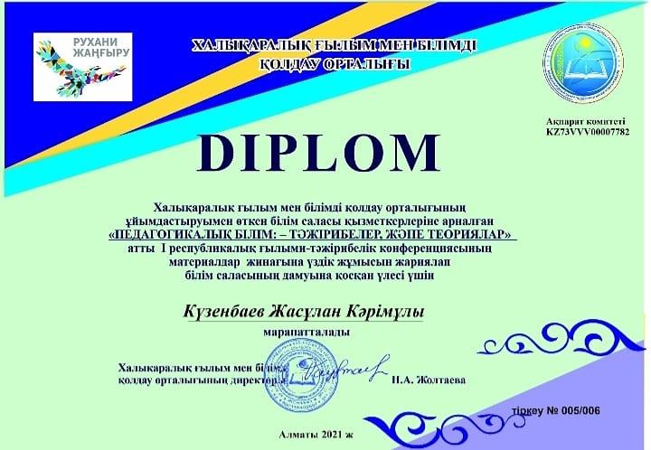 Халықаралық ғылым мен білімді қолдау орталығының ұйымдастыруымен өткен білім саласы қызметкерлеріне арналған "Педагогикалық білім: тәжірибелер және теориялар" атты І республикалық ғылыми-тәжірибелік конференциясында мектебіміздің "педагог-сарапшы" біліктілік санатындағы физика пәнінің мұғалімі Күзенбаев Жасұлан Кәрімұлы қатысып, жасаған баяндамасы үздік деп танылды. Оның "Нанотехнология— қазіргі заманауи физиканың жетістіктері" атты баяндамасы конференцияның мақалалар жинағында жарыққа шықты.