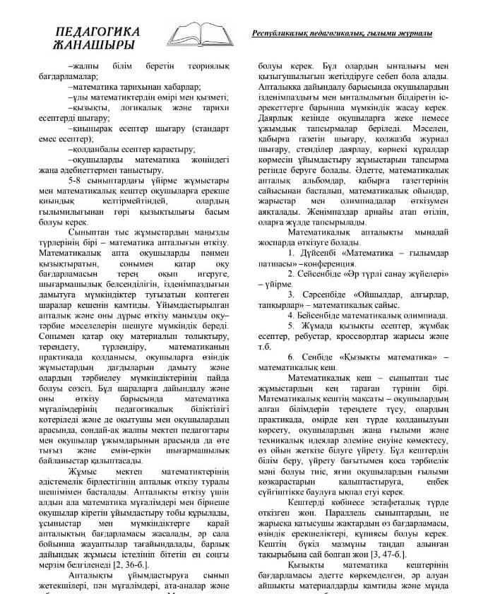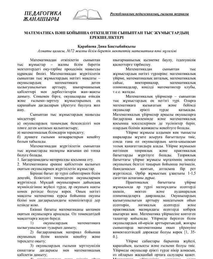 "Педагогика жанашыры" республикалық педагогикалық, ғылыми журналына мектебіміздің "педагог-модератор" біліктілік санатындағы математика пәнінің мұғалімі Қарабаева Дина Бақтыбайқызының "Математика пәні бойынша өткізілетін сыныптан тыс жұмыстардың ерекшеліктері" тақырыбындағы мақаласы жарыққа шықты. Аталған мақала жалпы білім беретін мектептерде математика пәнінен сыныптан тыс жұмыстарды ұйымдастыру форматы туралы айтылған.