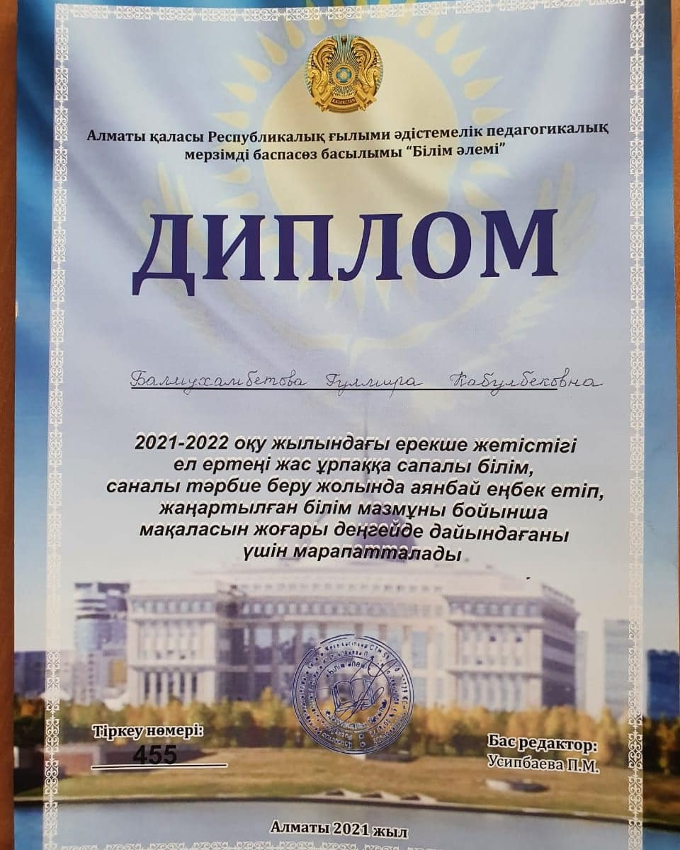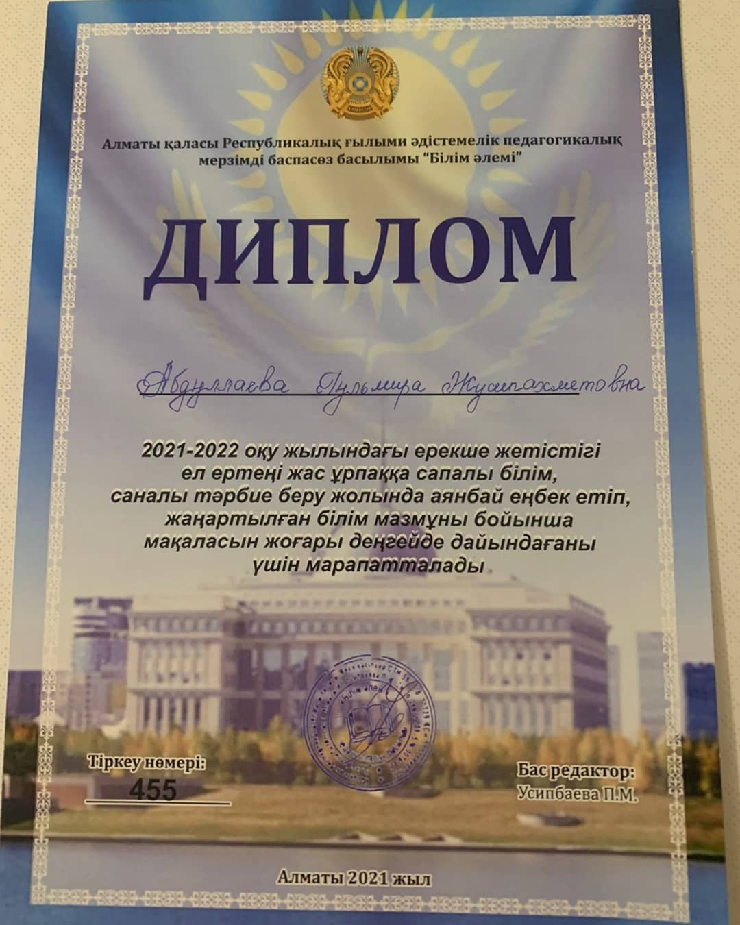 "Білім әлемі" республикалық ғылыми-педагогикалық басылымына (№3 Орыс тілі мен әдебиеті) мектебіміздің орыс тілі пәнінің мұғалімдері Балмухамбетова Гульмира Кабулбековна мен Абдуллаева Гульмира Жусипахметовнаның мақалалары жарыққа шықты. Іс-тәжірибелерін республика көлемінде таратып жүрген ұстаздарымызға алғысымызды білдіреміз.
