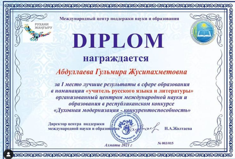 Халықаралық ғылым мен білімді қолдау орталығының ұйымдастыруымен "Бәсекелестік заманындағы рухани модернизация” тақырыбында өткен Республикалық білім беру саласы қызметкерлері арасында өткен байқаудың "Үздік орыс тілі мен әдебиеті пәні мұғалімі" номинациясы бойынша мектебіміздің "педагог-сарапшы" біліктілік санатындағы орыс тілі мен әдебиеті пәнінің мұғалімі Абдуллаева Гульмира Жусипахметовна жүлделі І орынды иеленді. Жеңісімен шын жүректен құттықтаймыз!