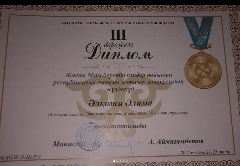 Шымкент қаласында өткен жалпы білім беретін пәндер бойынша оқушылардың республикалық ғылыми жобалар конкурсының ІІІ орын жүлдегері, мектебіміздің 10 "Б" сынып оқушысы Әлқожа Әлиманы шын жүректен құттықтаймыз. Әлиманың "Этномәдениеттану" секциясы бойынша "Қазақ қоғамындағы әйелдердің әлеуметтік-саяси мәртебесі (ХVIII-ХІХ ғғ.)" тақырыбындағы жобасы үздік деп танылып, ҚР білім және ғылым министрі Асхат Қанатұлы Аймағамбетовтің грамотасымен марапатталды. Ғылыми жетекшісі тарих пәнінің мұғалімі, педагог-модератор Төлегенов Абылай Көпбергенұлына алғысымызды білдіреміз.