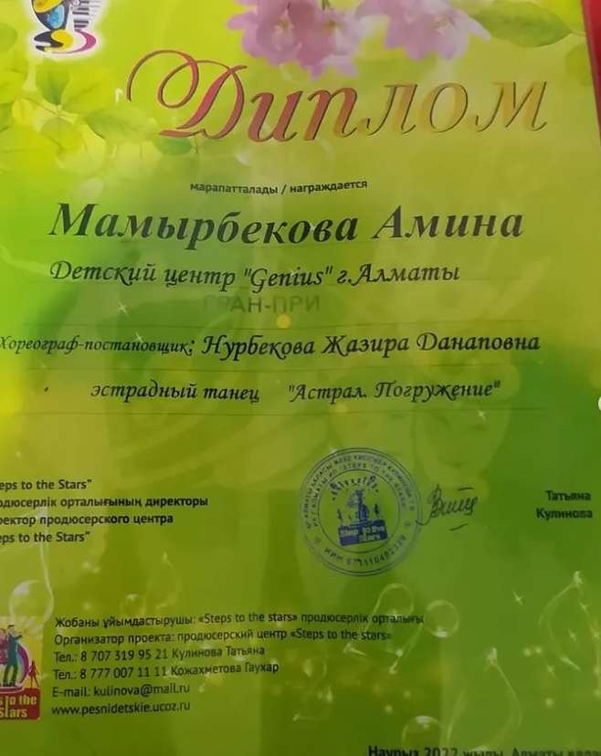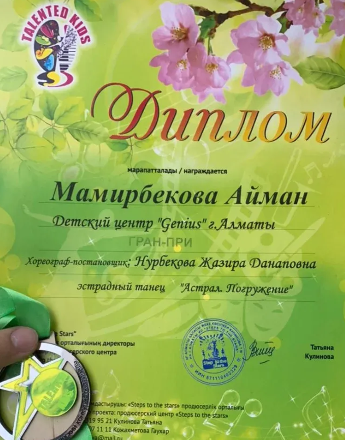 "Steps to the stars" продюсерлік орталығының ұйымдастыруымен өткен "Talented kids" республикалық конкурс-фестивалінде би номинациясы бойынша мектебіміздің 7 "А" сынып оқушысы Мамырбекова Амина және 8 "А" сынып оқушысы Мамырбекова Айман "Бас жүлдені" иеленді. Жеңістерімен шын жүректен құттықтаймыз!