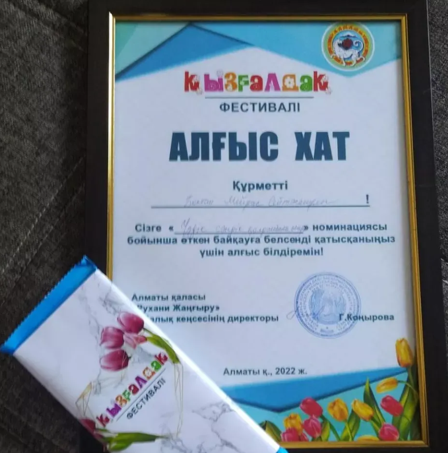 Алматы қаласы "Рухани жаңғыру" орталығының ұйымдастыруымен өткен "Қызғалдақ" фестивалінде "Үздік сәндік қолданбалы өнер" номинациясы бойынша мектебіміздің 4 "В" сынып оқушысы Бостан Мирас үздік деп танылып, Алғыс хатпен және ақшалай сыйлықтармен марапатталды.