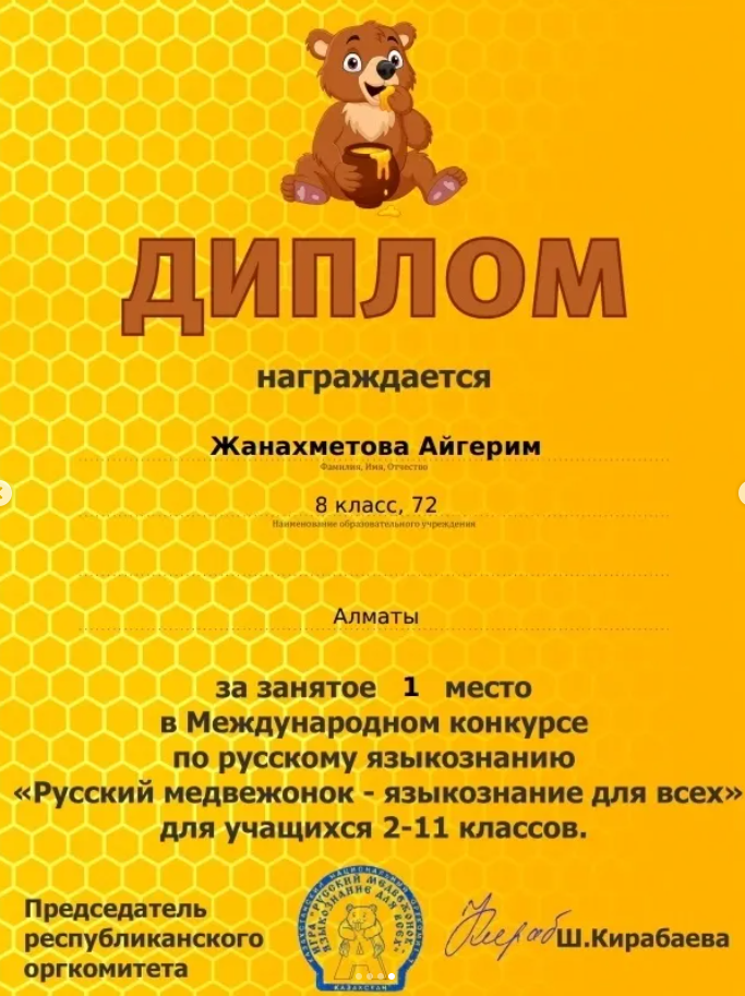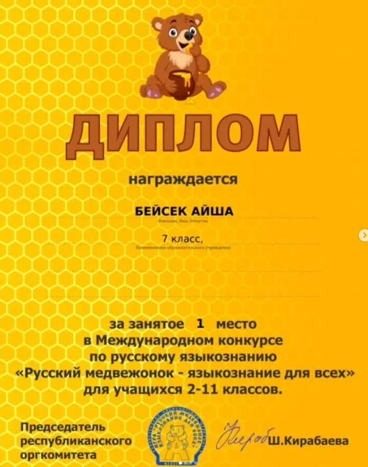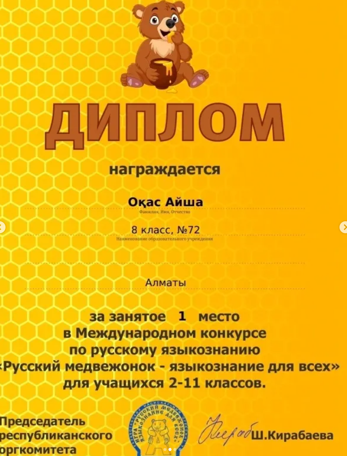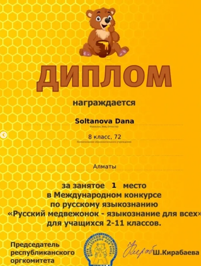 "Дарын лэнд" зияткерлік орталығының ұйымдастыруымен 2-11 сыныптар арасында өткен "Русский медвежонок—языкознание для всех" атты орыс тілі мен әдебиеті пәнінен Халықаралық конкурста жүлделі орын алған мектебіміздің оқушыларын шын жүректен құттықтаймыз. Конкурсқа дайындаған жетекшісі, орыс тілі мен әдебиеті пәнінің мұғалімі Балмухамбетова Гульмира Кабулбековнаға алғысымызды білдіреміз.