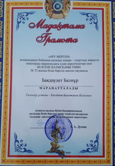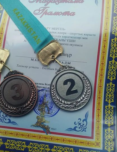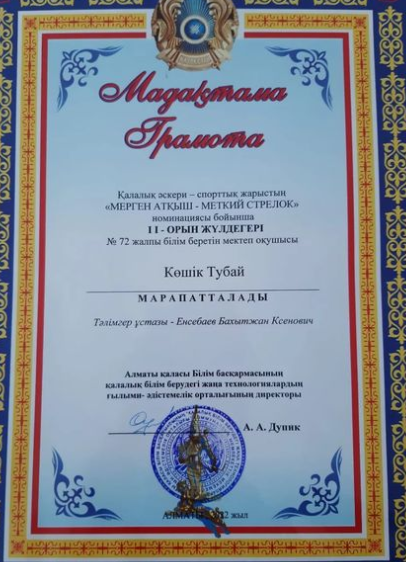 Алматы қаласы Білім басқармасының қалалық білім берудегі жаңа технологиялардың ғылыми-әдістемелік орталығының ұйымдастыруымен өткен ҚР Қарулы Күштерінің 30 жылдық және Ұлы Отан соғысындағы Жеңістің 77 жылдық мерекесі қарсаңында ұйымдастырылған қалалық әскери-спорттық жарыста "Жас мерген—юный стрелок" номинациясы бойынша 9 "Б" сынып оқушысы Әділбек Әділ жүлделі ІІІ орынды, "Мерген атқыш—меткий стрелок" номинациясы бойынша 9 "Б" сынып оқушысы Көшік Тубай жүлделі ІІ орынды, "Ару мерген" номинациясы бойынша белсене қатысқаны үшін 10 "Б" сынып оқушысы Бақдаулет Балнұр марапатталды.