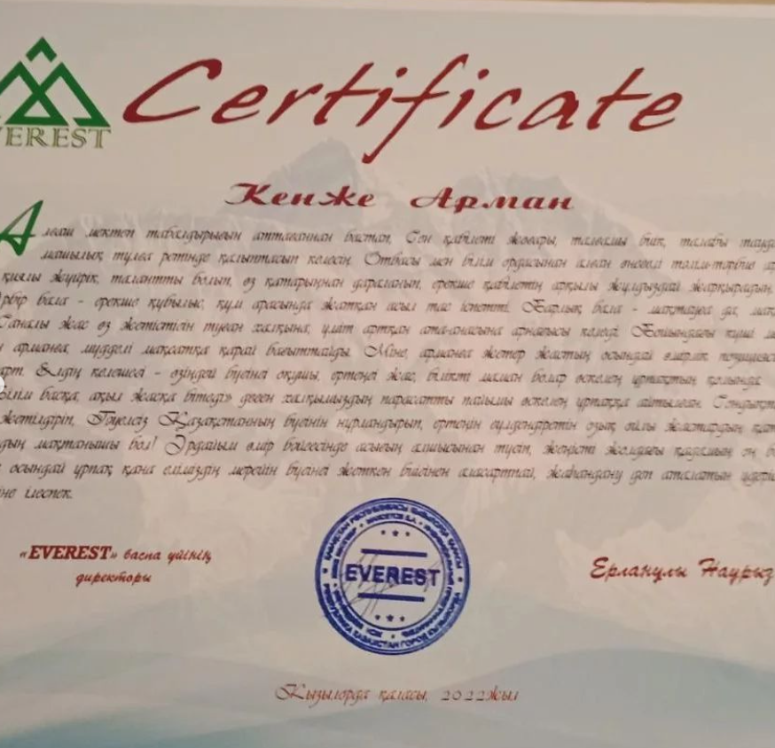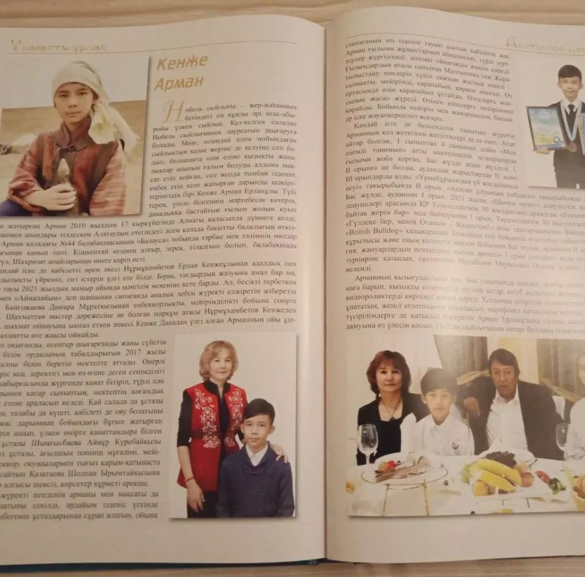 Мектебіміздің 5 "А" сынып оқушысы Кенже Арман "Ұлағатты ұрпақ—Достойное поколение" атты дарынды балалардың энциклопедиялық жинағына шықты. Арман— ғылыми жобалар мен конкурстарда жүлделі орын иеленіп жүрген озат оқушы.