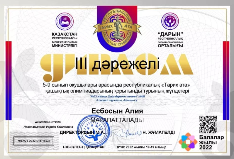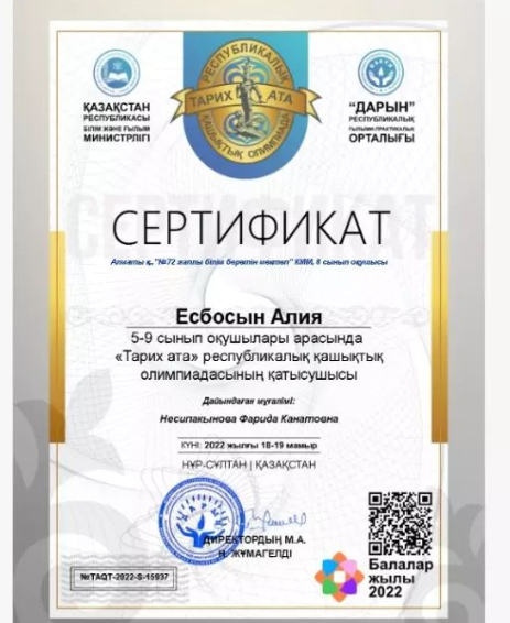 ҚР Білім және ғылым министрлігі "Дарын" республикалық ғылыми-практикалық орталығының ұйымдастыруымен өткен 5-9 сынып оқушылары арасында республикалық "Тарих ата" қашықтық олимпиадасында жүлделі орын алған мектебіміздің оқушыларын шын жүректен құттықтаймыз! Олимпиадаға дайындаған жетекшісі, мектебіміздің тарих пәнінің мұғалімі Несипакынова Фарида Канатовнаға алғысымызды білдіреміз.