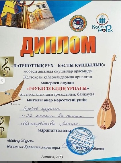 “Патриоттық рух-басты құндылық” жобасы аясында оқушылар арасында Желтоқсан қаһармандарына арналған МӘНЕРЛЕП ОҚУДАН “Тәуелсіз елдің ұрпағы” атты ҚАЛАЛЫҚ шығармашылық байқауында мектебіміздің 9 “А” сынып оқушысы Мамырбекова Амина ынталы өнер көрсеткені үшін марапатталды. Байқауға дайындаған жетекшісі, қазақ тілі мен әдебиеті пәні мұғалімі Муханова Акрысгул Сейлхановна.