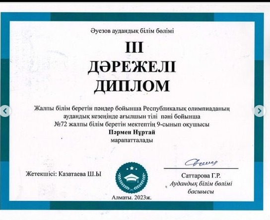 Ағылшын тілі пәні бойынша 9 «Б» сынып оқушысы Пәрмен Нұртай ІІІ 🥉орын. Жетекшісі: Казатаева Шолпан Ырымтаевна. @sholpankazatayeva