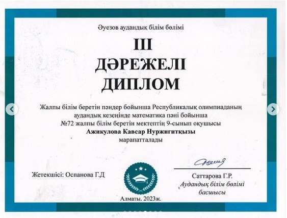 Математика пәні бойынша 9 «А» сынып оқушысы Ажикулова Кавсар ІІІ 🥉орын. Жетекшісі: Оспанова Гулжазира Динисламовна. @zhazzhaks