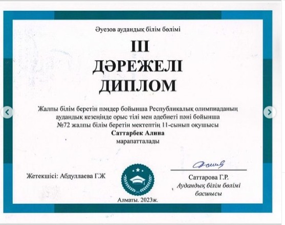 Орыс тілі мен әдебиеті пәні бойынша 11 «Б» сынып оқушысы Саттарбек Алина ІІІ 🥉орын. Жетекшісі: Абдуллаева Гулмира Жусипахметовна. @gulmira.zhusipakhmetkyzy