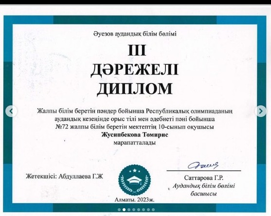 Орыс тілі мен әдебиеті пәні бойынша 10 «Б» сынып оқушысы Жусипбекова Томирис ІІІ 🥉орын. Жетекшісі: Абдуллаева Гулмира Жусипахметовна. @gulmira.zhusipakhmetkyzy