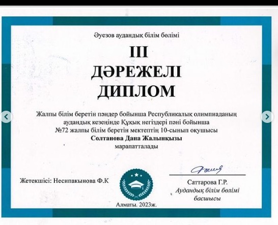 Құқық негіздері пәні бойынша 10 «А» сынып оқушысы Солтанова Дана ІІІ🥉 орын. Жетекшісі: Несипакынова Фарида Канатовна. @nesipakynova