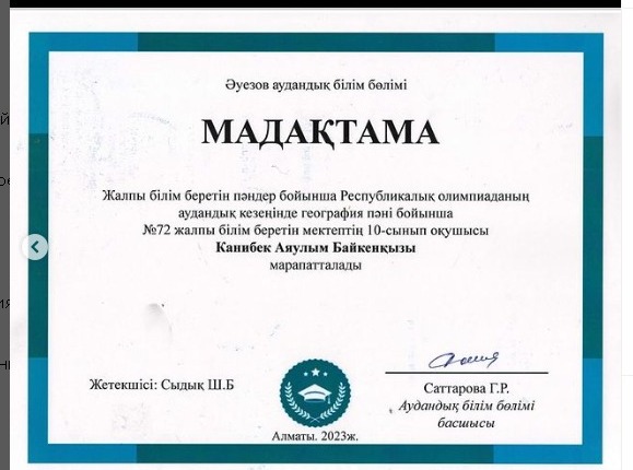 География пәні бойынша 10 «Б» сынып оқушысы Канибек Аяулым МАДАҚТАМА 📜. Жетекшісі: Сыдық Шолпан Бескемпірқызы. @sholpan.sydyk