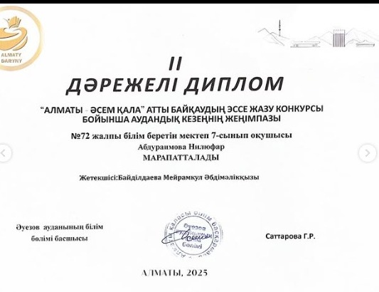 📌 Абдураимова Нилюфар – 7 «Б» сынып оқушысы, ІІ 🥈дәрежелі диплом;