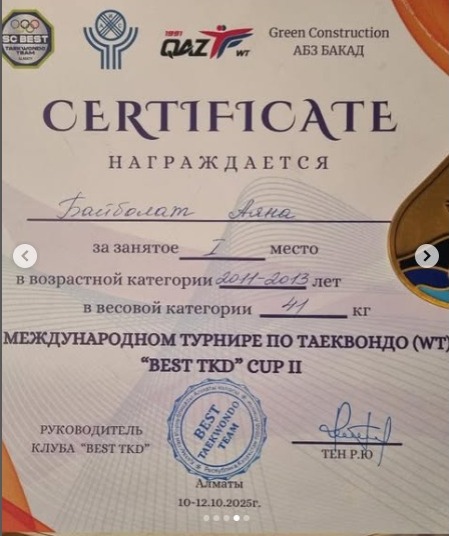 “BEST TKD” CUP II Таэквондодан (WT) Халықаралық турнирде мектебіміздің 8 “А” сынып оқушысы Байболат Аяна жүлделі І 🥇орынды иеленді. Жеңісімен шын жүректен құттықтаймыз! 👏💐