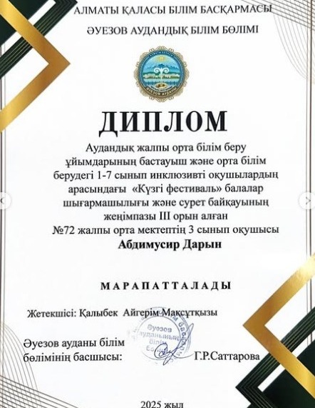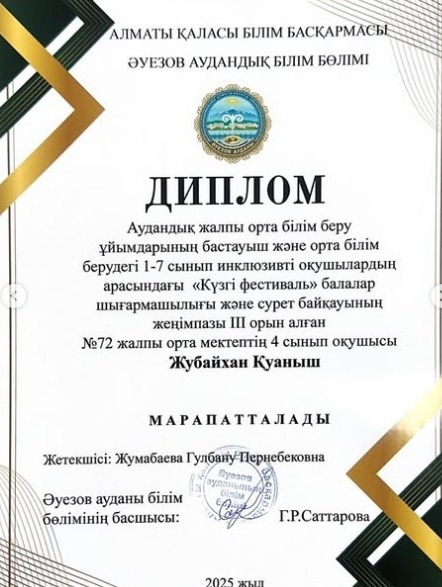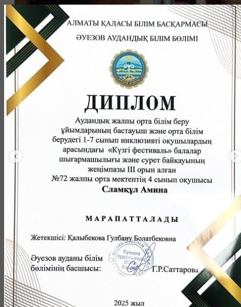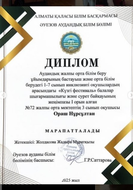 Аудандық жалпы орта білім беру ұйымдарының бастауыш және орта білім берудегі 1–7 сынып инклюзивті оқушыларының арасындағы «Күзгі фестиваль» балалар шығармашылығы және сурет байқауының жеңімпазы атанған мектебіміздің оқушыларын шын жүректен құттықтаймыз.
