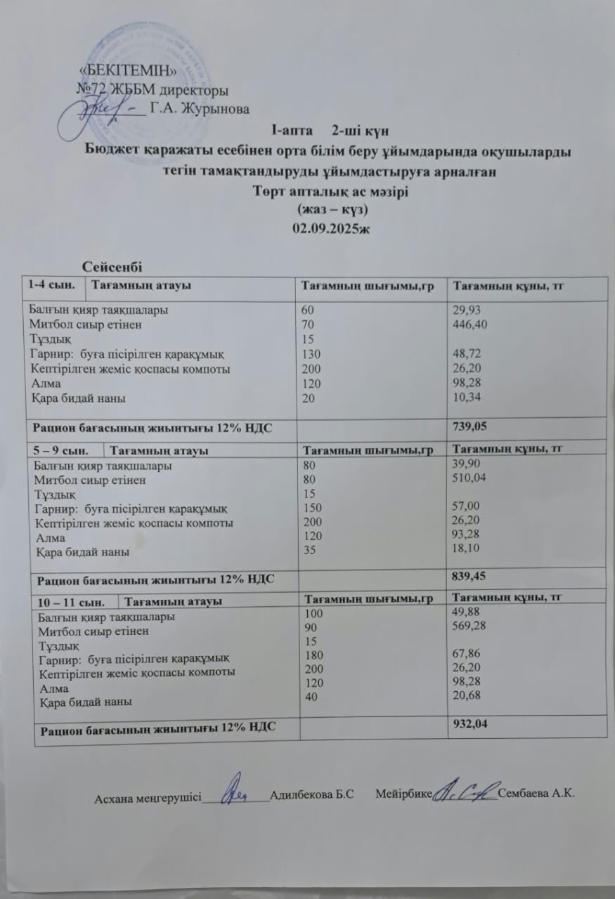» Ас мәзірі. 02.09.2025ж (1-апта, 2-күн)