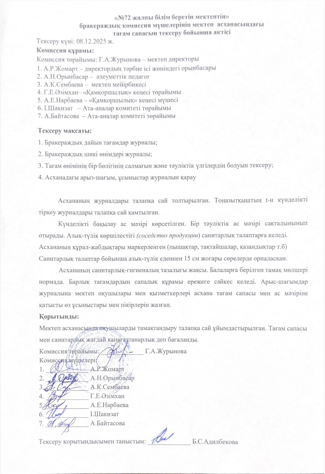 08 декабрь 2025 0 1 2 3 4 5 «№72 жалпы білім беретін мектептің» бракераждық комиссия мүшелерінің мектеп асханасындағы тағам сапасын тексеру бойынша актісі
