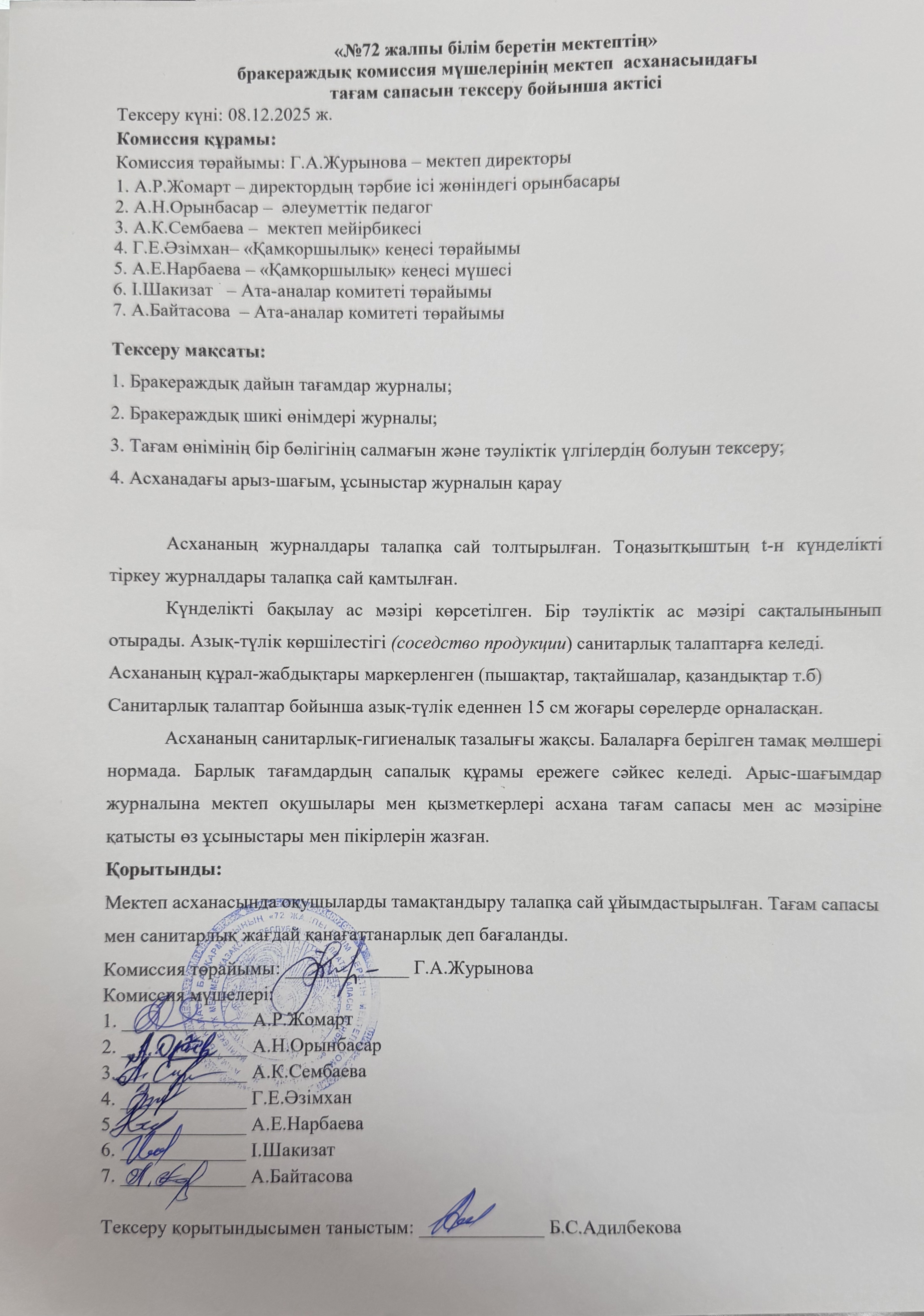 » » «№72 жалпы білім беретін мектептің» бракераждық комиссия мүшелерінің мектеп асханасындағы тағам сапасын тексеру бойынша актісі